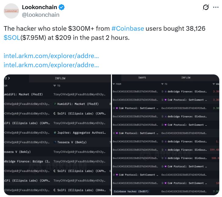 A wallet address labeled by blockchain security analysts as the “Coinbase hacker” bought $8 million in Solana on Sunday using their reportedly ill-gotten gains.