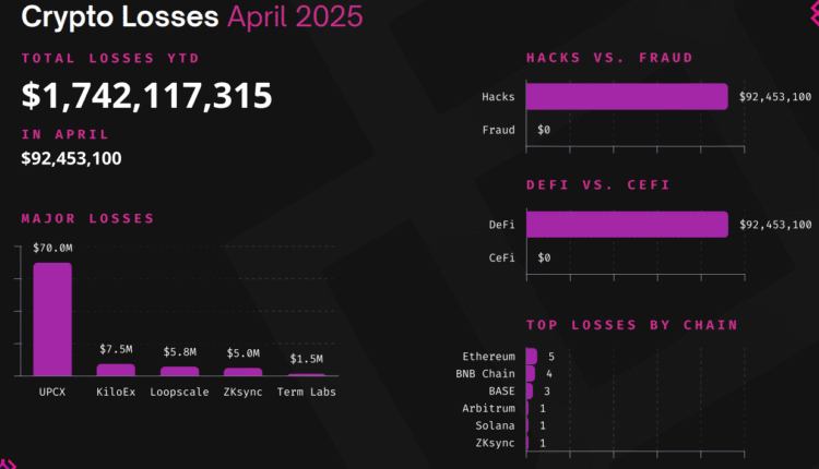 The month’s largest hack on open-source platform UPCX accounted for most of the damage in April, with over $70 million in losses, while KiloEx lost $7.5 million as April’s second-largest hack.