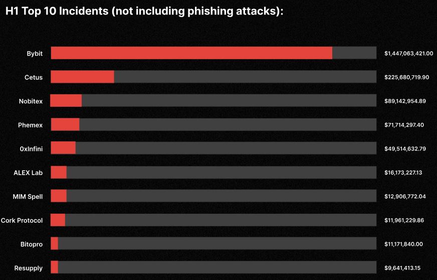 The Bybit and Cetus Protocol hacks are responsible for most of the losses in the first alf of 2025. Source: CertiK