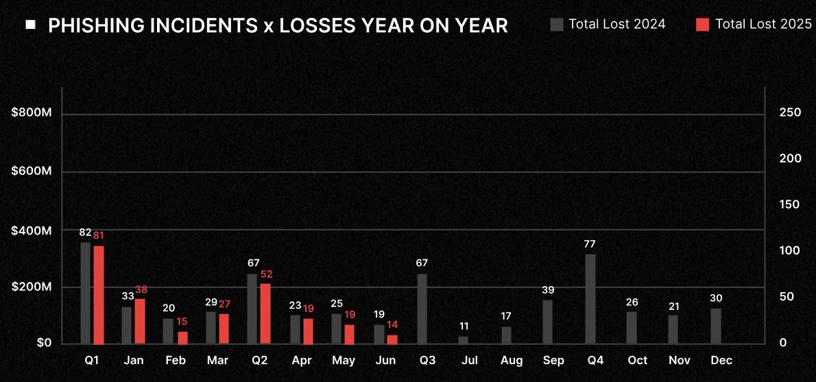 The number of phishing attacks has surged in the first half of 2025. Source: CertiK