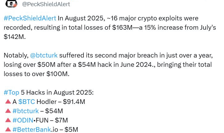Blockchain security firm PeckShield said in an X post on Monday that August’s losses are a 15% increase compared to July, which only recorded $142 million, though it’s down 47% year on year.