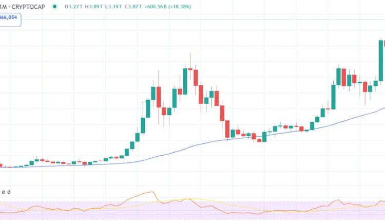 Binance-owned CoinMarketCap shows peak crypto market capitalization figures at $3.8 trillion, while TradingView has the number at $3.9 trillion, higher than the previous peak of $3.73 trillion in December.