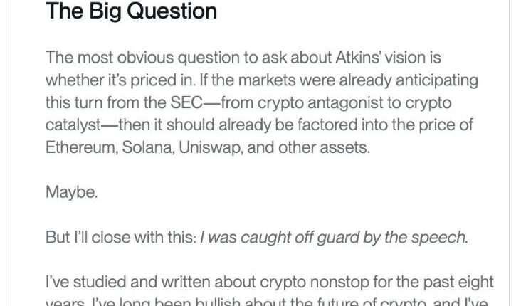 Bitwise’s Matt Hougan on Tuesday said the speech caught him “off guard” and left him wondering whether Atkins’ vision has been priced into the market.