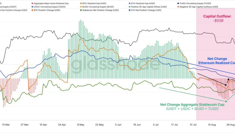 The analysis is based on the aggregate realized value metric, which measures the realized capital of Bitcoin (BTC) and Ether (ETH) with the combined supply from the top five stablecoins: Tether (USDT), USD Coin (USDC), Binance USD (BUSD), Dai (DAI) and TrueUSD (TUSD). “A deep dive into the data reveals a prevailing trend: by early August, the industry had begun to experience capital outflows,” notes the report.