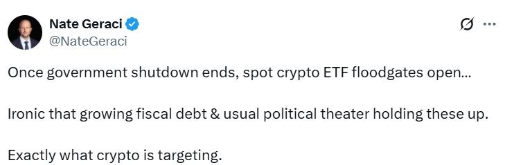 ETF analyst and NovaDius Wealth Management president Nate Geraci predicted in an X post on Monday that “Once government shutdown ends, spot crypto ETF floodgates open,” with mass approvals expected.