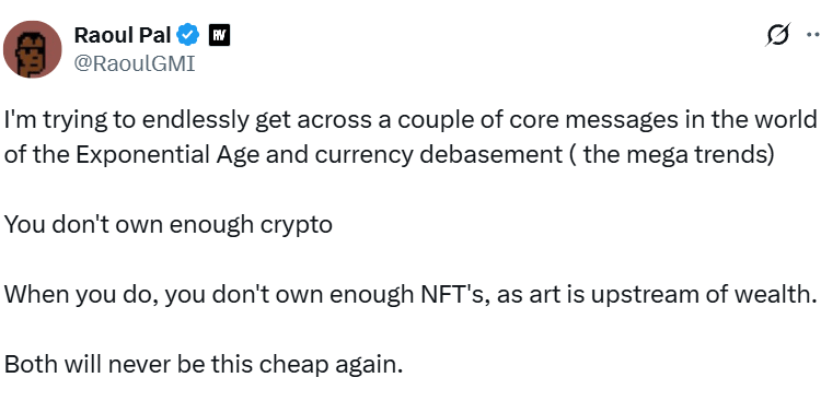 “You don’t own enough crypto. When you do, you don’t own enough NFT’s, as art is upstream of wealth. Both will never be this cheap again,” Pal said.