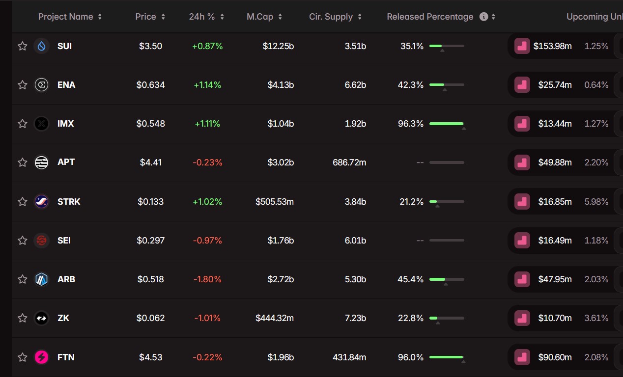 FTN comes second with $90 million in tokens to be added to the supply. Unlike Sui, FTN has already released over 96% of its tokens. This means the unlock represents a smaller relative increase in supply.