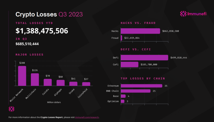 Crypto and Web3 projects suffered a 153% increase in attack incidents from July to September 2023 compared to the same period in 2022, according to a report from blockchain security platform Immunefi. In Q3 2022, there were a total of 30 attack incidents. But in Q3 2023, this number swelled to 76. Nearly $686 million was lost in the recent quarter.