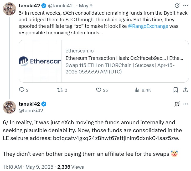 In the Bybit hack, decentralized swap protocol THORChain was used as the main bridge to swap around 500,000 Ether (ETH) to Bitcoin.