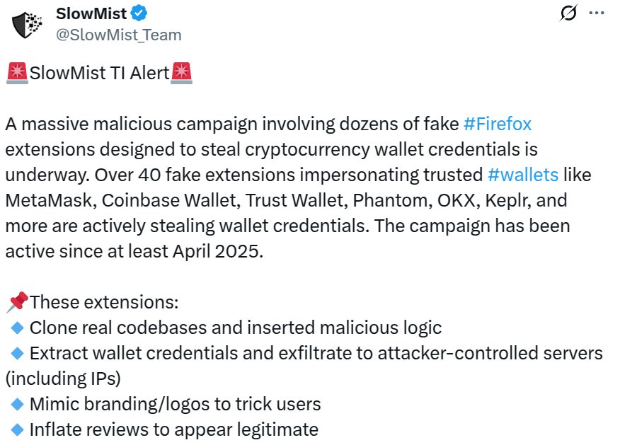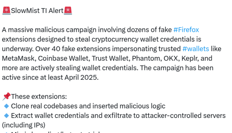 More than 40 fake extensions for the popular web browser Mozilla Firefox have been linked to an ongoing malware campaign to steal cryptocurrencies from users, according to a report published Wednesday by cybersecurity firm Koi Security.
