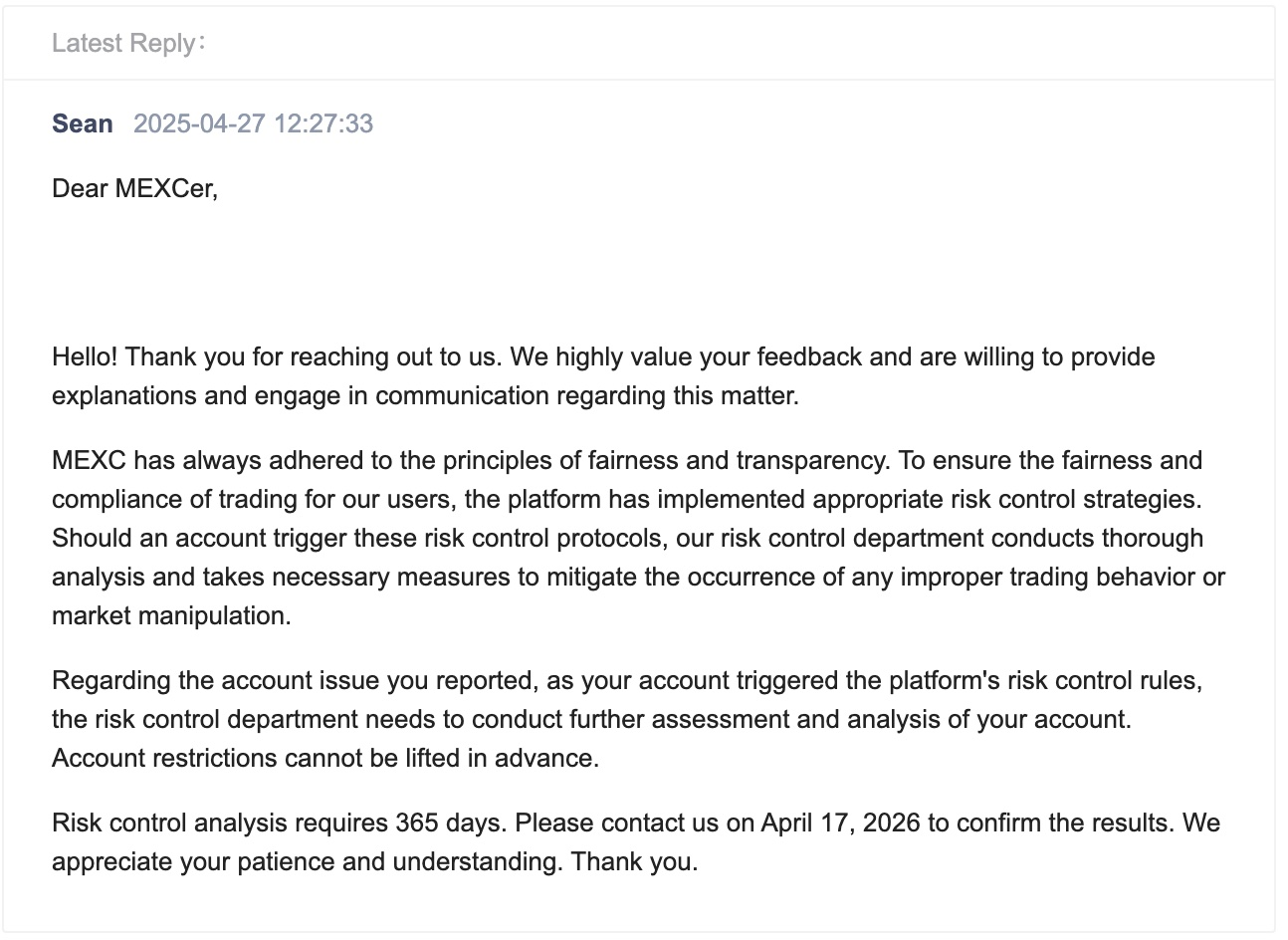 Still, account restrictions “are imposed strictly because they triggered our risk control rules, not due to profitability,” a spokesperson for MEXC told Cointelegraph, adding the exchange’s 12-month review period applies “exclusively to accounts involved in coordinated violations, high-risk accounts, or compliance-related risks, and does not affect all users subject to risk control measures.”
