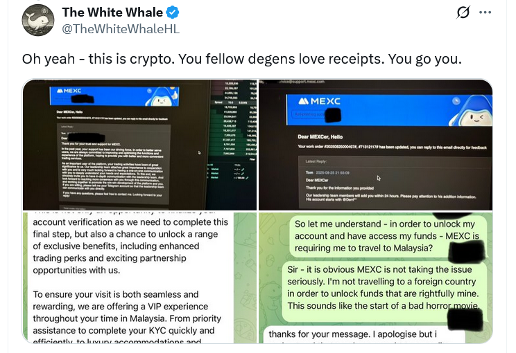 A cryptocurrency trader upsized his multimillion-dollar social media pressure campaign against MEXC after claiming that the digital asset exchange requested an in-person meeting to unfreeze the user’s $3 million worth of personal funds.