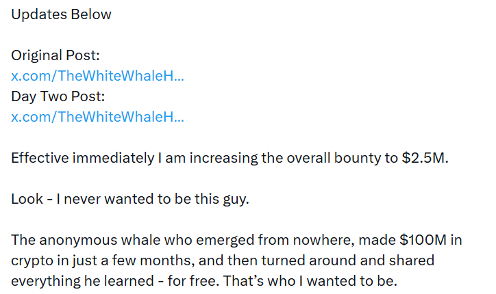 On Tuesday, the trader announced increasing the “bounty” against MEXC to $2.5 million, allocating an additional $250,000 for the group of users who participate in his social media campaign, which includes minting a free non-fungible token (NFT) on the Base network, tagging MEXC or its chief operating officer’s X account with the “#FreeTheWhiteWhale” tag.