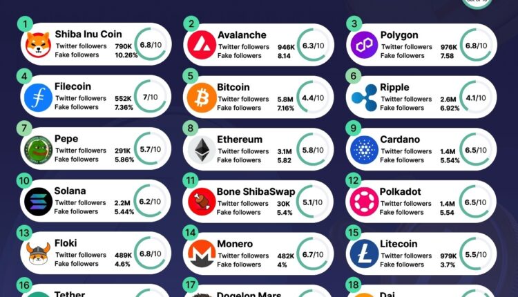When it comes to the official accounts of cryptocurrency tokens and ecosystems, Shiba Inu (SHIB) had the highest number of fake followers at 10.26% or 80,000 accounts, while Avalanche (AVAX) ranked second with 8.14% fake followers, followed by Polygon (MATIC) with 7.58% or 73,000 fake accounts.