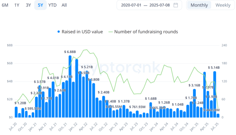 June accounted for the lion’s share, pulling in $5.14 billion, the highest monthly figure since January 2022, according to data from CryptoRank. The surge followed months of relative stagnation, suggesting that the appetite for crypto is recovering.