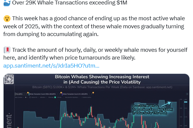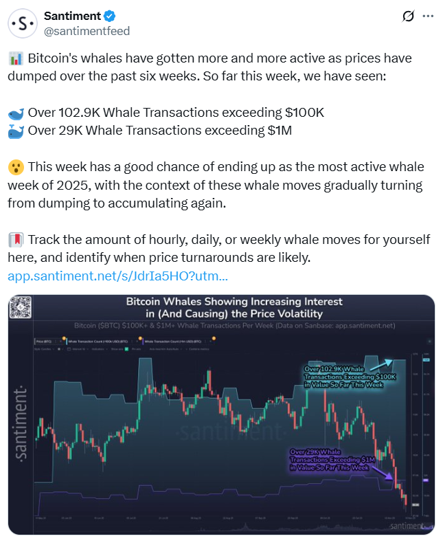 Bitcoin (BTC) dropped below $90,000 this week — the first time in seven months. Santiment said it has already tracked over 102,000 whale transactions exceeding $100,000, and a further 29,000 transactions over $1 million.