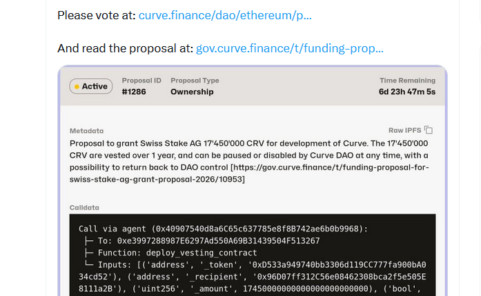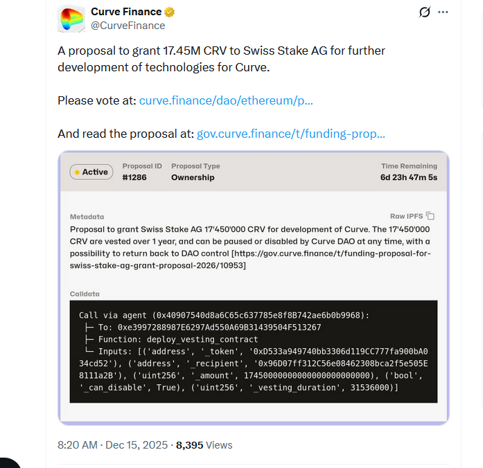 The grant, worth approximately $6.6 million at current prices, would be awarded to Swiss Stake AG, the firm behind Curve, and follows a previous grant awarded in late 2024.