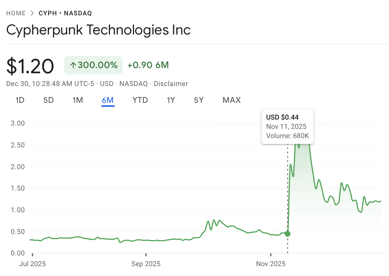 Formerly a biotech company called Leap Therapeutics, the company rebranded in November as Cypherpunk Technologies, as a Zcash-focused digital asset company. The company’s stock has surged almost 170% to about $1.18 at time of writing, from $0.44 before it rebranded, according to Google Finance data.