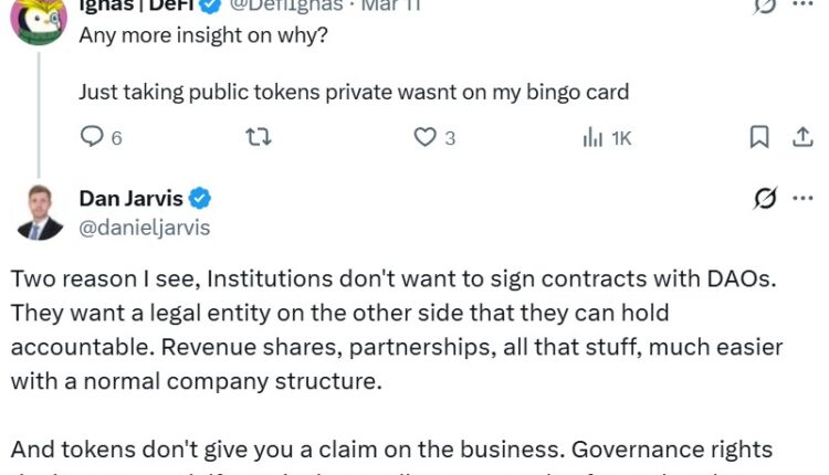 “The original idea behind governance tokens was coordination, not ownership… If they just become equity substitutes, then the experiment has basically collapsed back into the corporate model it was supposed to challenge,” he said.