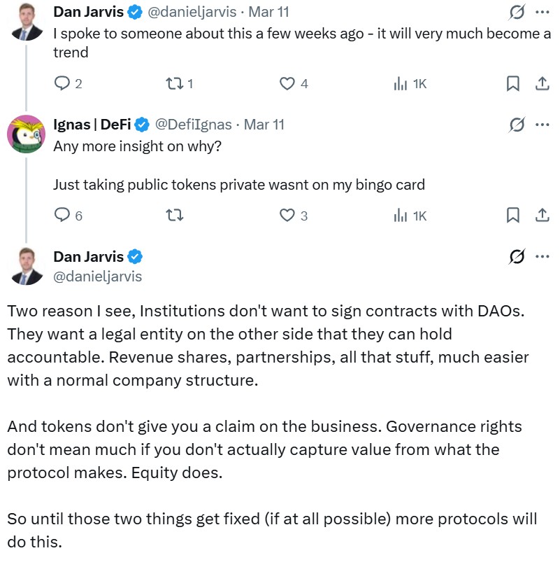 Social media debates shifted toward tokenized equity as the way to go over the traditional corporate structure, with Ignas claiming that it would be progress for the industry. But Black thinks that says more about token designs than the concept, as many governance tokens already function as pseudo equity.