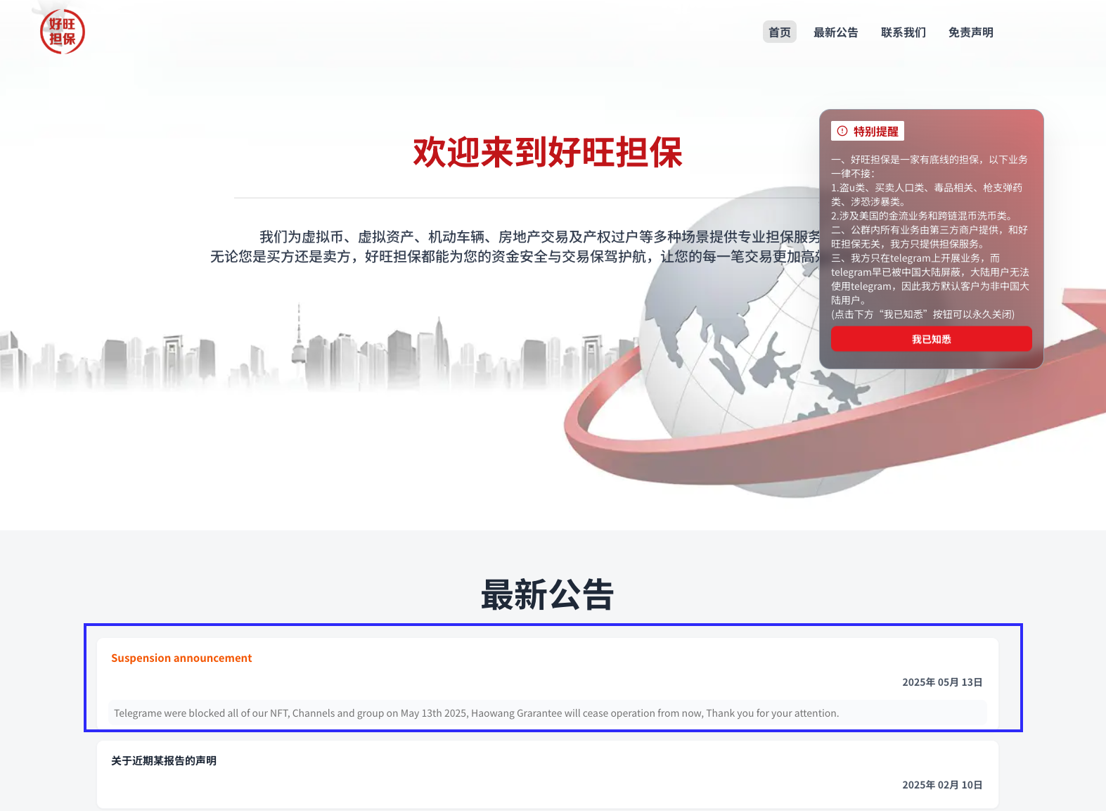Haowang Guarantee, formerly Huione Guarantee, said on May 13 that it was shutting down after the Telegram messaging service banned thousands of its associated accounts and channels.