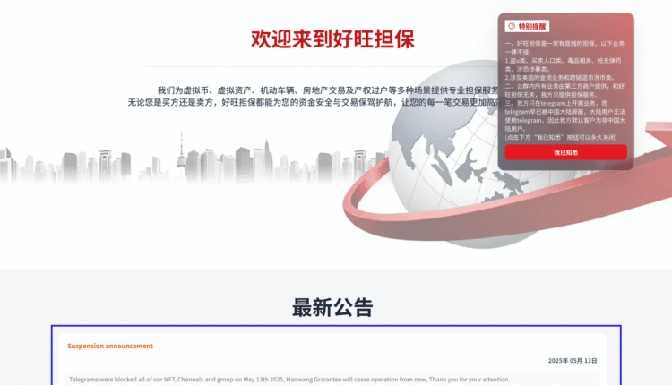 Haowang Guarantee, formerly Huione Guarantee, said on May 13 that it was shutting down after the Telegram messaging service banned thousands of its associated accounts and channels.