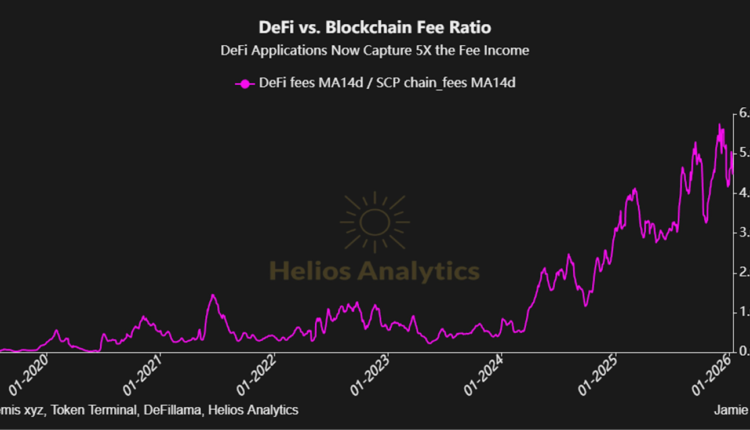 Decentralized finance (DeFi) applications now capture five-times the fees generated by blockchains, according to data shared by Jamies Coutts, chief crypto analyst at crypto intelligence platform Real Vision.