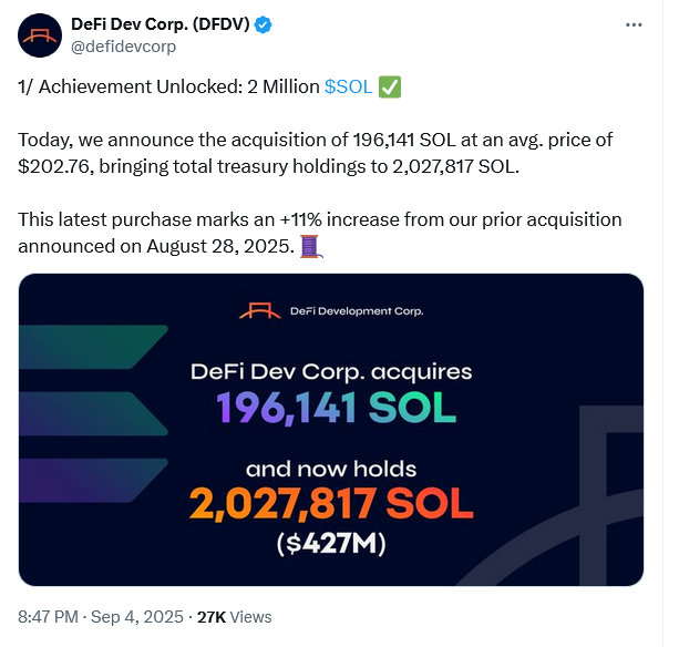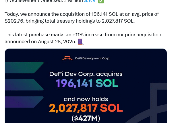 Solana treasury company DeFi Development Corp has bought $39.76 million worth of Solana, bringing the company’s total holdings of SOL to 2 million.