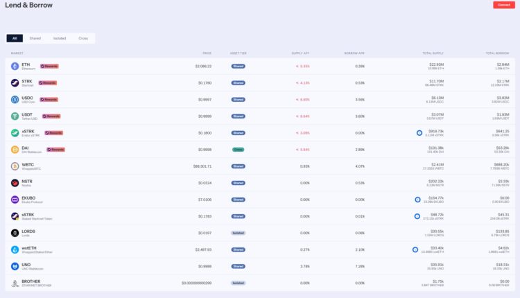 On Nostra, users post collateral in one token to borrow in another token. The DeFi protocol’s most popular collateral tokens are Ether, STRK, and stablecoins USDC (USDC) and Tether (USDT).
