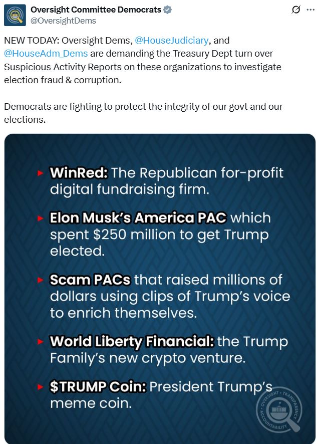 Penned by representatives Gerald Connolly, Joseph Morelle, and Jamie Raskin, the May 14 letter asks Treasury Secretary Scott Bessent for all SARS filed since 2023 related to World Liberty Financial (WLF) and the Official Trump (TRUMP) token.