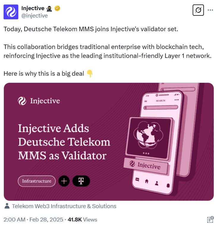 Deutsche Telekom MMS, a subsidiary that provides consulting and software development services, will validate transactions and participate in onchain governance, according to the Feb. 27 blog post from Injective.