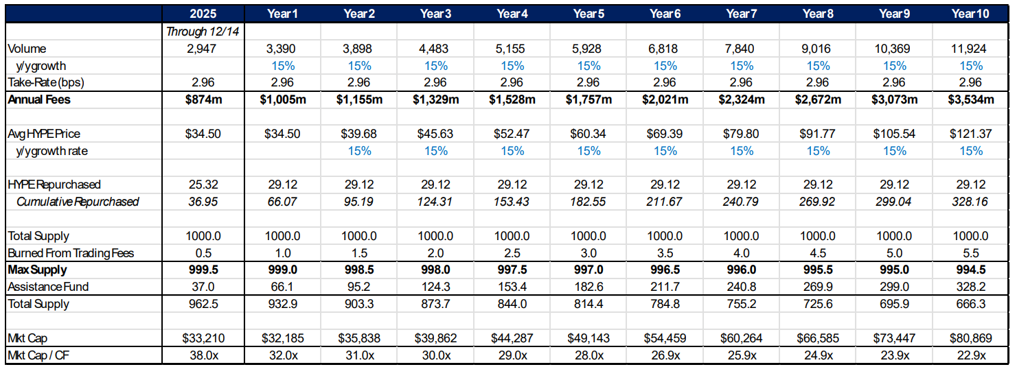 “Given the fact that all fees are returned to token holders via buybacks, we make the argument that HYPE should trade at closer to 50x,” by 2035, wrote the company in a research note published on Dec. 16, adding: