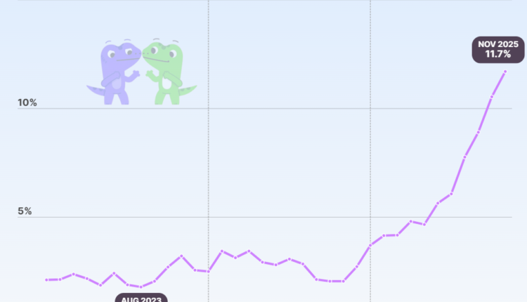 The market share of perpetual futures DEXs rose from 2.1% in January 2023 to a new all-time high of 11.7% in November 2025, according to a report by data aggregator CoinGecko.