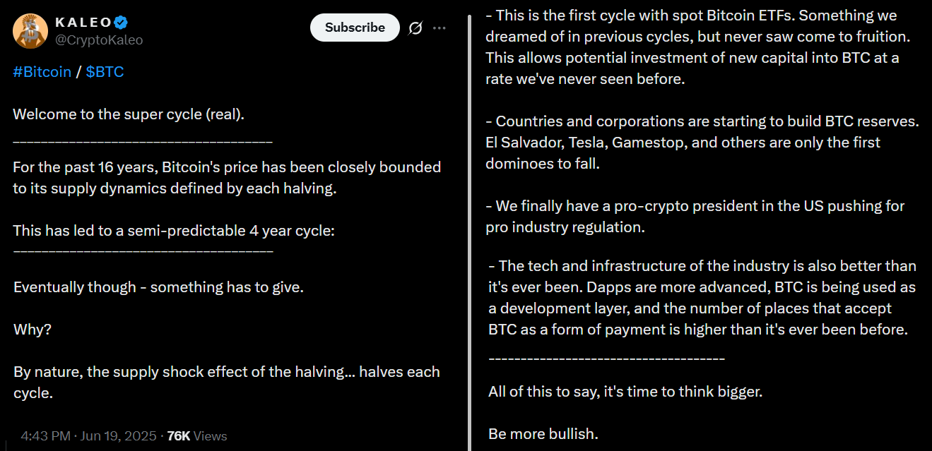Since 2021, a number of analysts have suggested a new paradigm in which the crypto market would soar 400% beyond its previous highs. Take, for example, X user CryptoKaleo, who recently posted about the “real” super cycle.