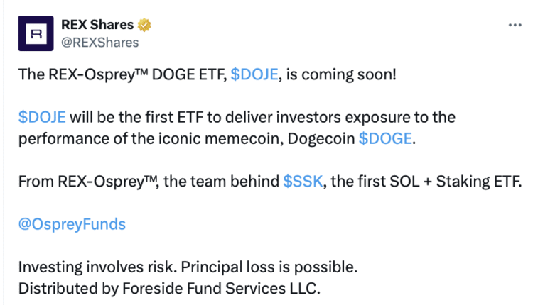 “Looks like Rex is going to launch a Doge ETF via the 40 Act a la $SSK next week based on below tweet combined w how they just filed an effective prospectus,” Balchunas said in an X post on Thursday, pointing to exchange-traded fund (ETF) issuer REX Shares filing a prospectus with the US Securities and Exchange Commission (SEC).