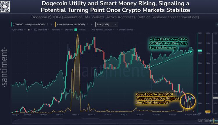 Onchain data from Santiment shows that wallets holding at least 1 million DOGE have increased by 1.24% since early February, despite declining prices. Meanwhile, active addresses have surged to a four-month high, suggesting rising network activity.