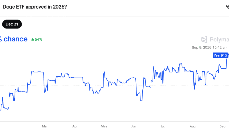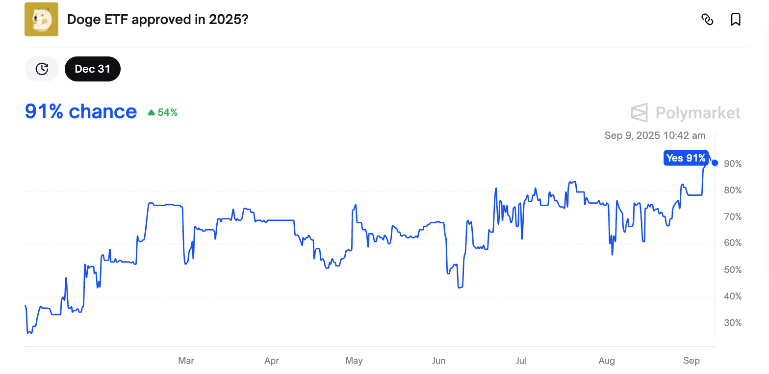 Polymarket bettors are highly optimistic, placing the odds of a spot DOGE ETF in 2025 at 91%.