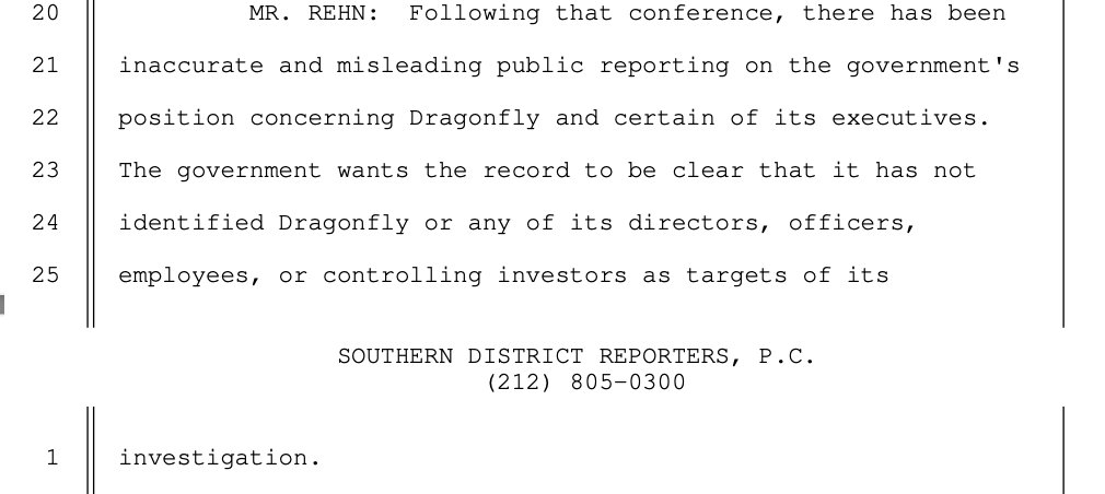 “They have stated on the record in the trial Monday morning that the media reports that they were planning to bring charges against Dragonfly were inaccurate, and neither Dragonfly nor any of its principals are targets in their investigation.”