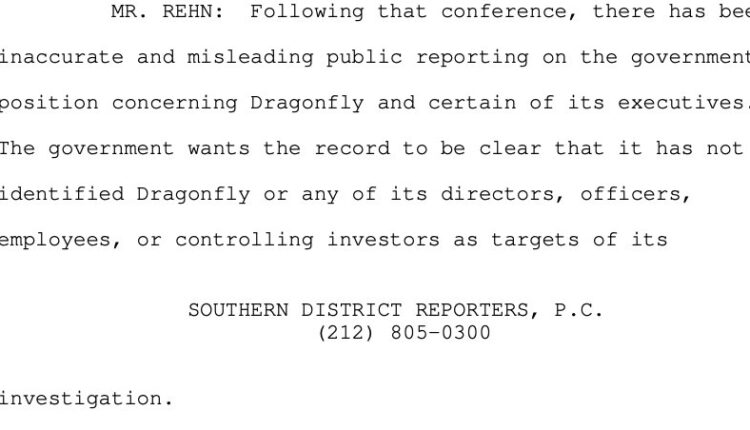 “They have stated on the record in the trial Monday morning that the media reports that they were planning to bring charges against Dragonfly were inaccurate, and neither Dragonfly nor any of its principals are targets in their investigation.”