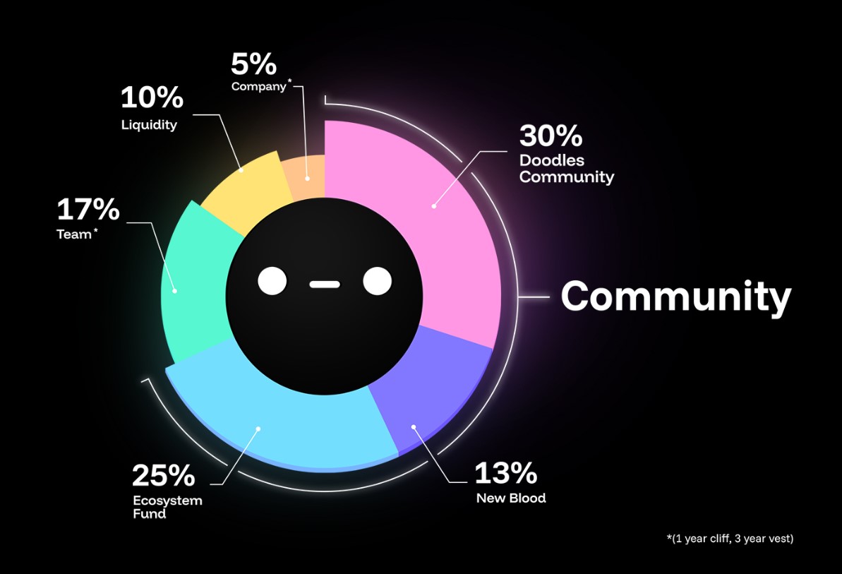 According to the team, 68% of the tokens will be allocated to community members: 30% to the Doodles community, 13% to the New Blood community and 25% as its ecosystem fund.