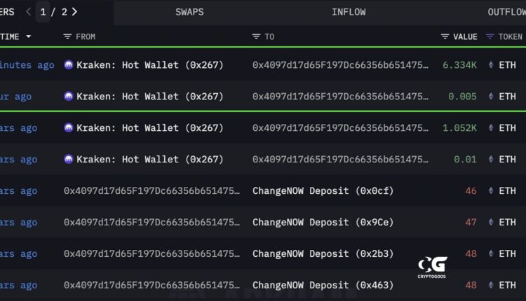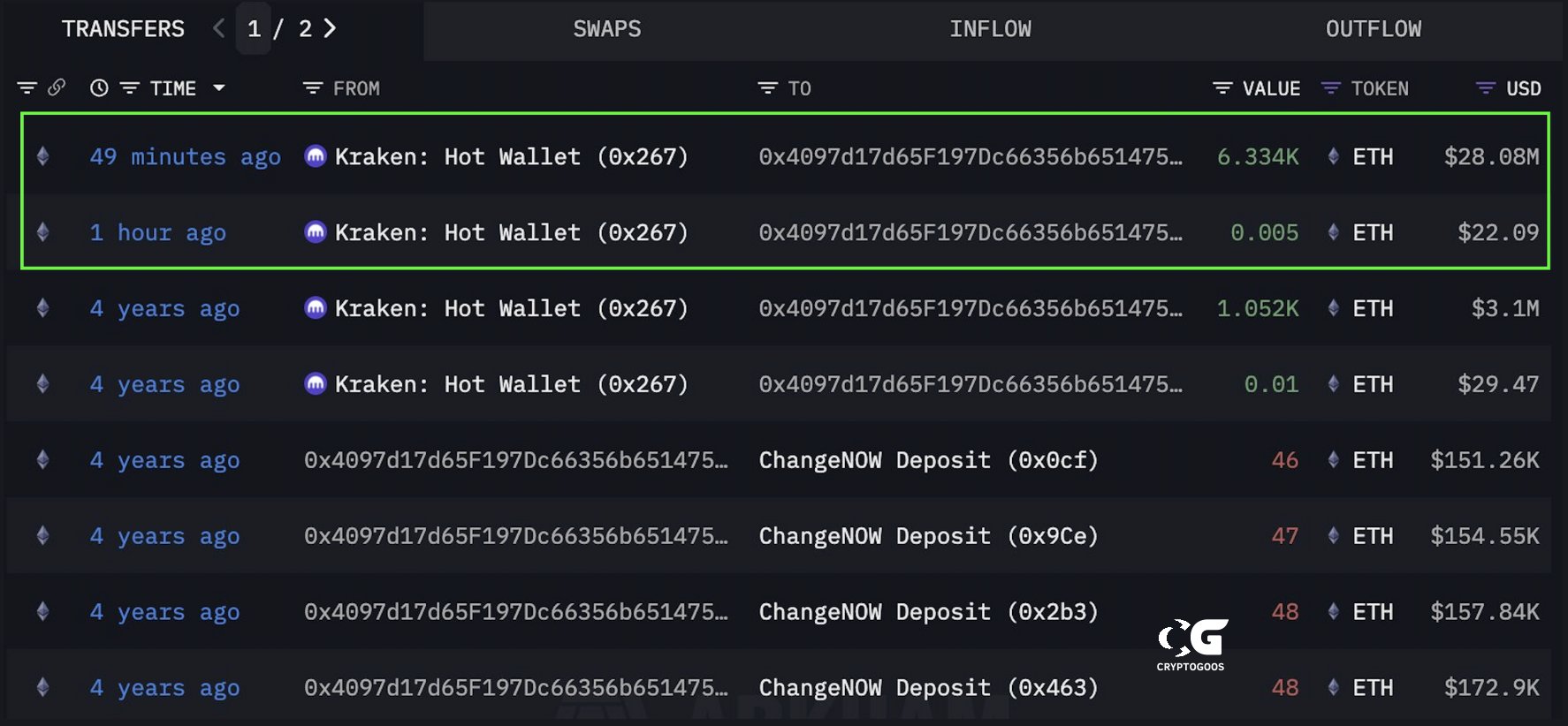 On Tuesday, the entity withdrew 6,334 ETH (worth around $28.08 million) from Kraken in the past hour, according to onchain data cited by analyst CryptoGoos. The same address last interacted with the exchange in 2021.
