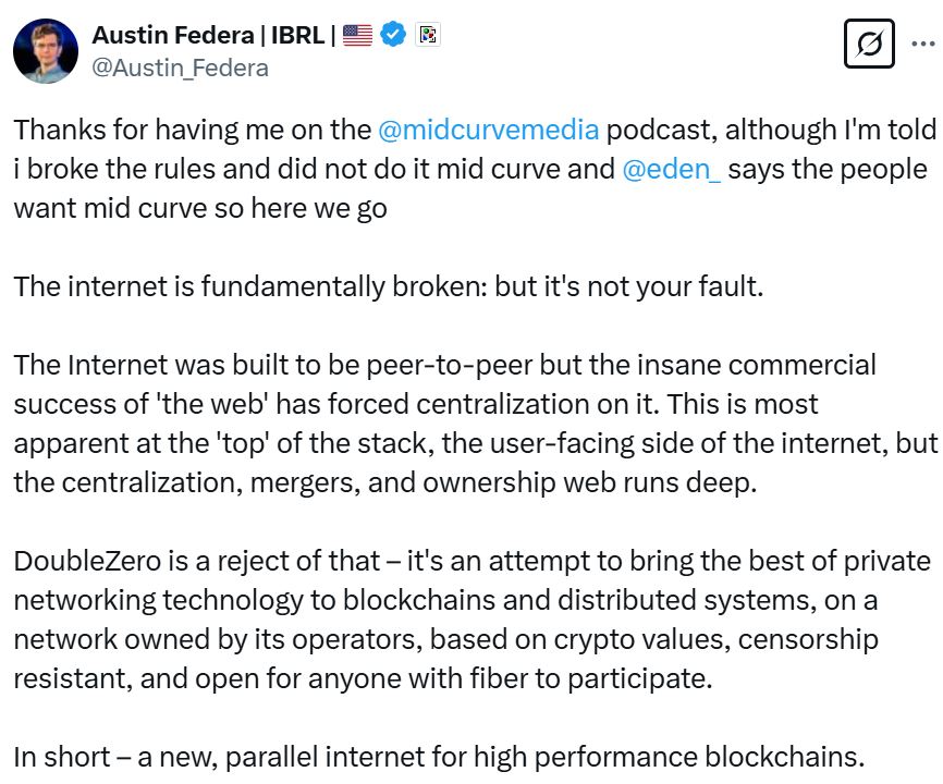 Austin Federa, co-founder of DoubleZero, said in a March 5 post to X that the project is an attempt to bring private networking technology to blockchains and distributed systems on a network owned by its operators and that it is open for anyone with fiber to participate.