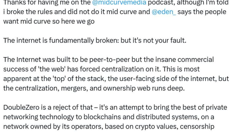 Austin Federa, co-founder of DoubleZero, said in a March 5 post to X that the project is an attempt to bring private networking technology to blockchains and distributed systems on a network owned by its operators and that it is open for anyone with fiber to participate.