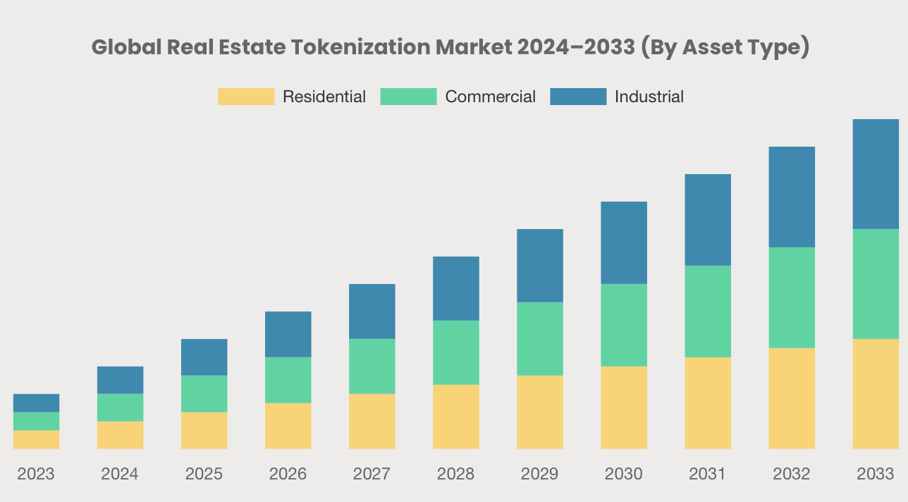 According to Custom Market Insights, the global real estate tokenization market is expected to reach a $19.4 billion market cap by 2033, growing at a compound annual rate of 21%. All three types of real estate — residential, commercial, and industrial — will play a role.