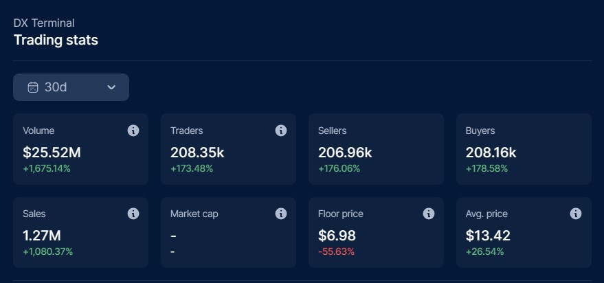 Meanwhile, Base’s DX Terminal took the number four spot in trading volume with $25.5 million, showcasing a nearly 1,700% surge, according to DappRadar.