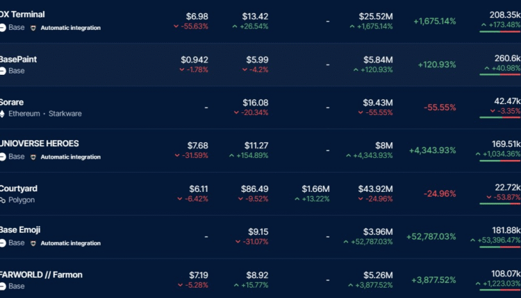 Meanwhile, Base’s DX Terminal took the number four spot in trading volume with $25.5 million, showcasing a nearly 1,700% surge, according to DappRadar.