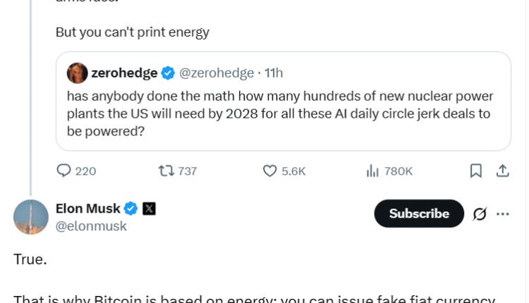 “That is why Bitcoin is based on energy: you can issue fake fiat currency, and every government in history has done so, but it is impossible to fake energy,” Musk wrote in a Tuesday X post.