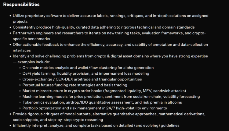 According to a newly posted job listing, the company is recruiting a remote “Finance Expert – Crypto” to help teach xAI’s models how professional crypto traders analyze on-chain data, evaluate token economics and manage risk in volatile, always-on markets.