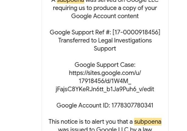 The fake subpoena appears to be from a Google no-reply domain. Source: Nick Johnso