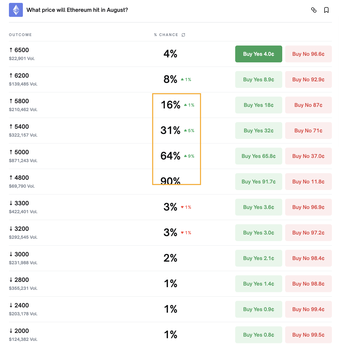 • Ether trades at $4,600 with a 64% chance of hitting $5,000 by Aug. 31.